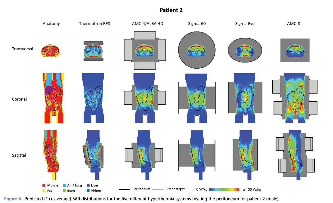 En 2020, Kok et al.[5] publicaron otro estudio de simulación con Plan2Heat. En esta ocasión, analizaron el calentamiento peritoneal en un fantoma y dos pacientes de cáncer pancreático. Modelaron un sistema capacitivo y varios radiativos, entre ellos, el sistema AMC-4 (el equivalente comercial a ALBA 4D, fabricado por Med-Logix). En el estudio se optimizaron y evaluaron las distribuciones de SAR.