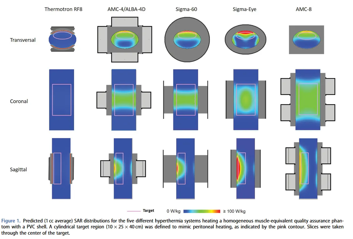 En la mayoría de objetivos profundos, los sistemas capacitivos no muestran un calentamiento apropiado, con muy bajas temperaturas en el tumor. Por el contrario, la hipertermia radiativa, en general, resultó más efectiva en tumores pélvicos profundos. El estudio predijo temperaturas en el objetivo (T90) 1-3 °C más altas sin que se produjeran puntos calientes limitantes del tratamiento[6].